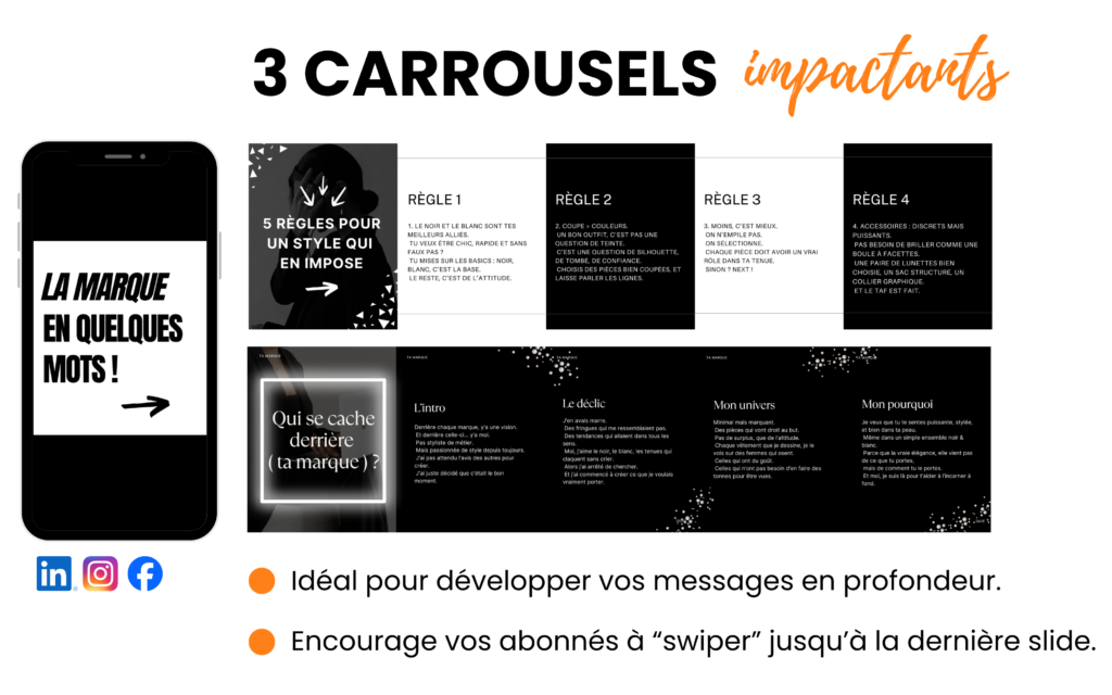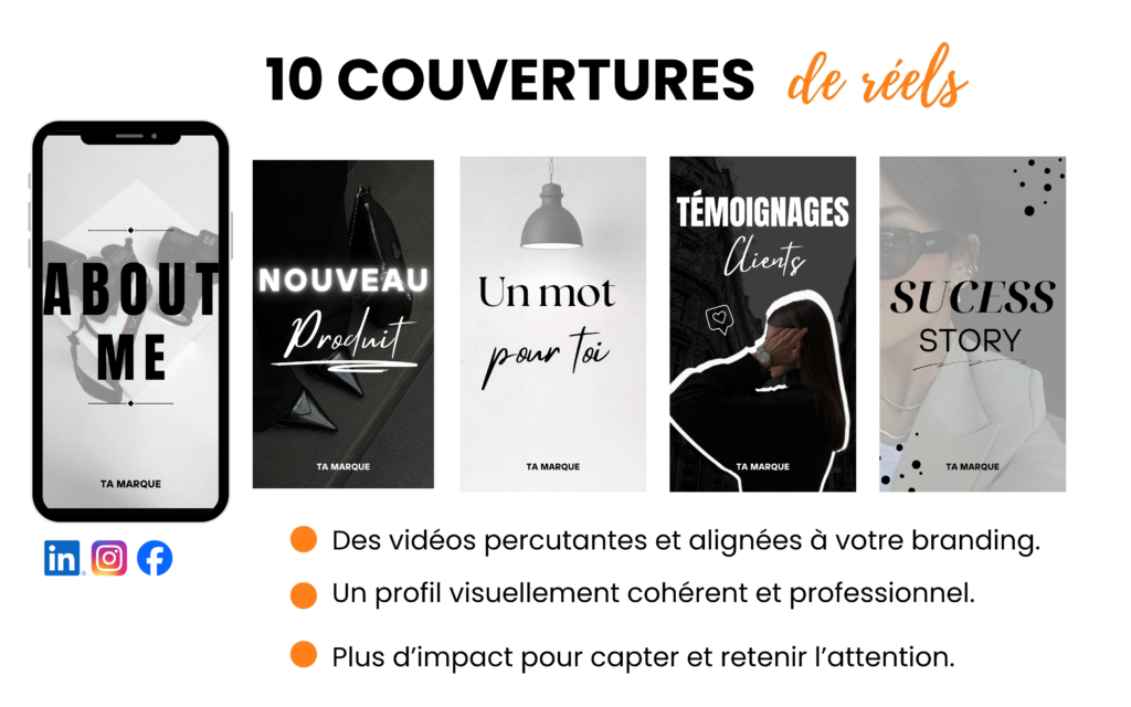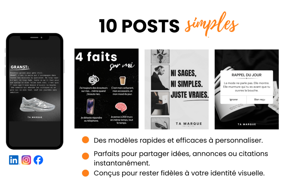 Nous l’avons pensé en noir et blanc, avec une esthétique épurée et moderne. Des visuels propres, clairs & élégants : le type de contenu qui donne tout de suite une impression de sérieux et de style, sans en faire trop.
